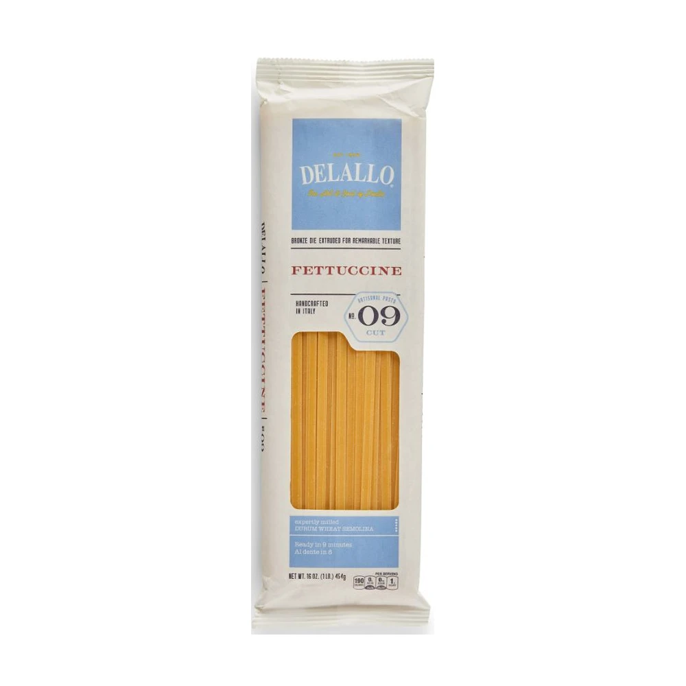 Descripción: Pasta italiana tipo fettuccine No. 09 de la marca DeLallo, elaborada con sémola de trigo duro y moldeada en bronce para una textura superior. Su forma plana y ancha permite una excelente adherencia de salsas cremosas, logrando platos más intensos y consistentes. Ideal para negocios que buscan opciones más robustas dentro de pastas largas.