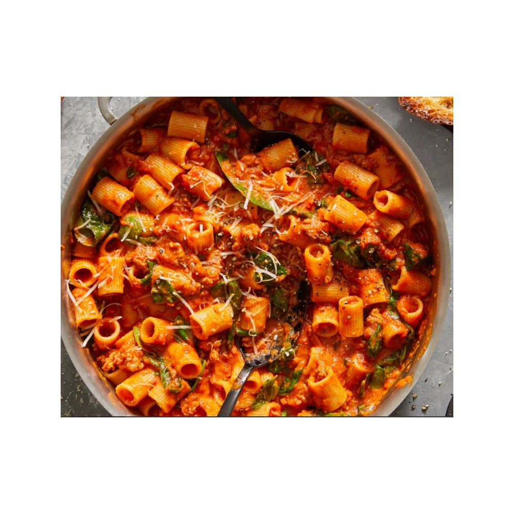 Origen e historia: El rigatoni es una pasta tradicional del centro y sur de Italia, conocida por su forma tubular y estriada. La versión mezzi surge como una variante más corta, diseñada para facilitar su consumo y mejorar la integración con salsas densas en la cocina diaria.